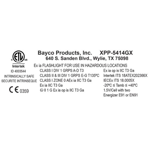 NIGHTSTICK XPP-5414GX to iskrobezpieczna, bateryjna latarka kątowa LED z certyfikatem ATEX. Wyposażona w system Dual-Light™, łączy w sobie 3 funkcje świetlne: światło skupione, rozproszone oraz oba te rodzaje światła działające jednocześnie. Latarka może być użytkowana w naziemnych strefach zagrożonych wybuchem gazów. Źródłem światła są dwie diody CREE® LED o mocy 120 lumenów każda. Energię zapewniają 2 baterie typu AA, które pozwalają na ciągłe używanie latarki przez 24 h! Jest niezwykle lekka - jej masa z bateriami to zaledwie 116 g.