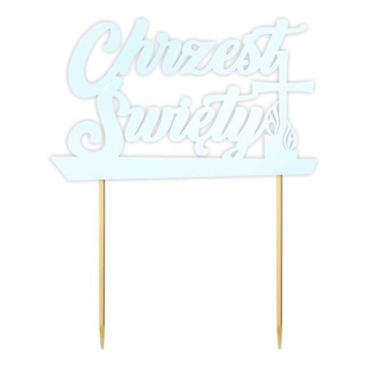 Pięknie błyszczący topper z napisem Chrzest Święty. Topper wykonany z grubego, perłowego brystolu w blado niebieskim kolorze. Ozdobi tort upieczony specjalnie z okazji tego pięknego, dziecięcego przyjęcia. Dekoracja pięknie połyskująca, czy to w blasku świec, czy światła słonecznego, doda szyku i przemieni zwykły tort w małe dzieło sztuki.