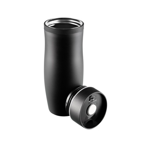 Plastikowa pokrywka z gwintem i uszczelką zapewnia szczelne zamknięcie. Pokrywka posiada wygodny przycisk, który umożliwia kliknięciem jednym palcem otwarcie i zamknięcie kubka.