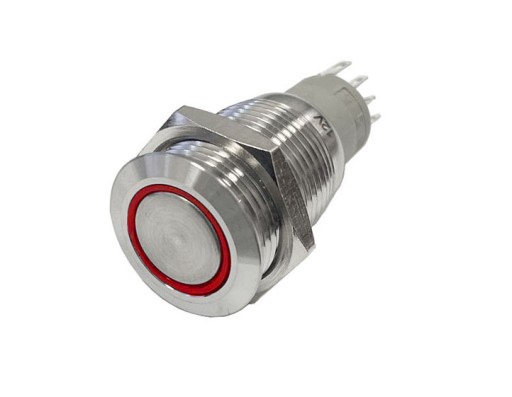 Włącznik wciskany, wykonany ze stali nierdzewnej AISI 304. Podświetlany ledowo na kolor czerwony. Montaż podtynkowy.