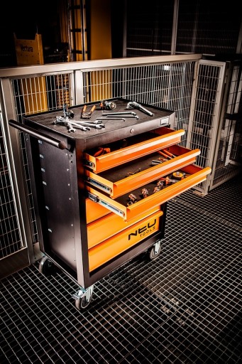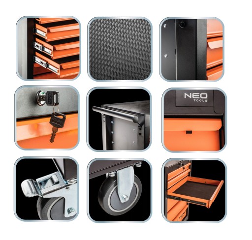 Szafka posiada 7 praktycznych szuflad na narzędzia, zamykanych za pomocą zamka centralnego. Wszystkie szuflady są w pełni otwierane, posiadają prowadnice kulkowe, zapewniające długoletnie, płynne i niezawodne działanie. Szuflady zabezpieczone są blokadą zapadkową, która zapewnia ochronę otoczenia w czasie transportu.