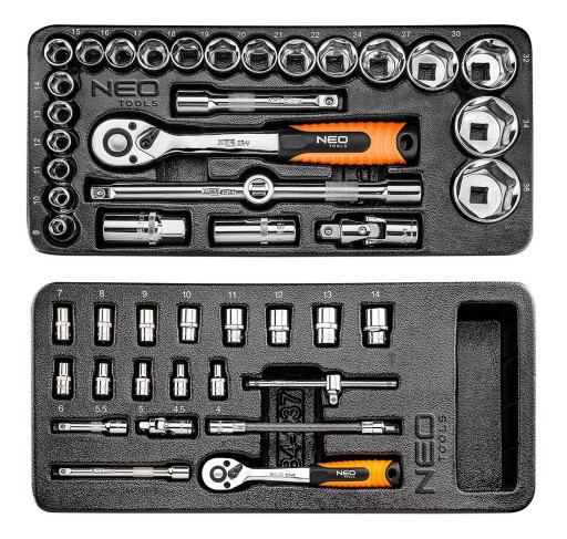 - 20 szt. nasadek sześciokątnych, rozmiary: 8, 10, 11, 12, 13, 14, 15, 16, 17, 18, 19, 20, 21, 22, 24, 27, 30, 32, 34, 36 mm