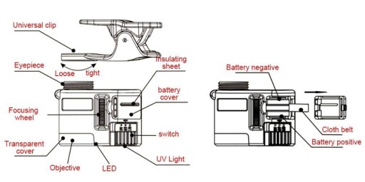 Klips umożliwia przypięcie urządzenia do telefonu aby wygodnie obejrzeć powiększaną rzecz. Lupa posiada szerokie zastosowanie w jubilerstwie, modelarstwie precyzyjnym, elektronice, serwisowaniu sprzętu.