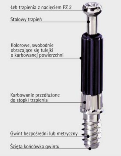 Dzięki swobodnie obracającej się tulejce tworzywowej, w trakcie montażu za pomocą wkrętarki akumulatorowej, trzpień może być przytrzymywany aż do całkowitego wkręcenia. Dzięki temu wyeliminowane zostało ryzyko skaleczenia o ostre krawędzie.