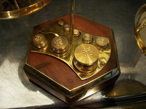 W otworach osadzone są mosiężne odważniki. Stelaż wagi wykonano z mosiądzu, szalki z blachy pokrytej mosiądzem. Waga działa ale odważniki nie są legalizowane.