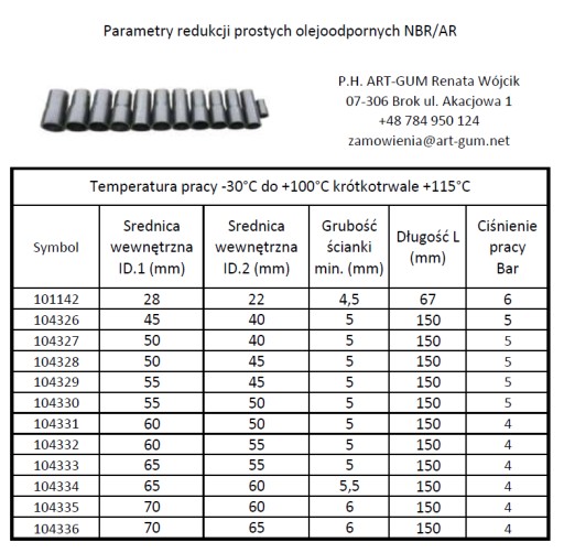- Warstwa zewnętrzna: guma NBR czarna, gładka, odporna na paliwa i oleje, ozon i warunki atmosferyczne.