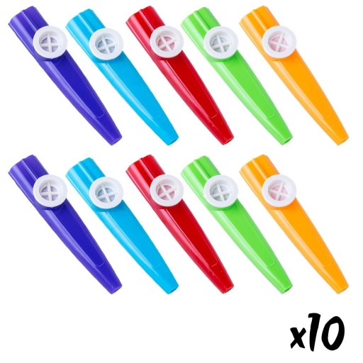 - 10 plastikowych kazoo o losowych kolorach.