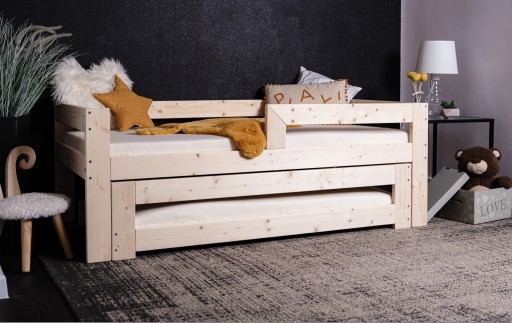 Łóżko wysuwane podwójne 2w1 to model o nowoczesnym designie, którego konstrukcja została wykonana z najwyższej jakości drewna- świerku skandynawskiego. Drewno jest naturalne i nie zawiera żadnych substancji i związków chemicznych. Nie ma lepszego i bardziej wytrzymałego surowca do budowy konstrukcji szkieletowych. Nie można go porównać z płytą prefabrykowaną MDF pod względem wytrzymałości, sztywności konstrukcji, która bardzo wpływa na bezpieczeństwo użytkowników tym bardziej dzieci.