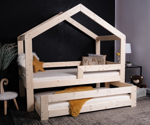 Łóżko Symetryczne Domek podwójne 2w1 to model o nowoczesnym designie, którego konstrukcja została wykonana z najwyższej jakości drewna- świerku skandynawskiego. Drewno jest naturalne i nie zawiera żadnych substancji i związków chemicznych. Nie ma lepszego i bardziej wytrzymałego surowca do budowy konstrukcji szkieletowych. Nie można go porównać z płytą prefabrykowaną MDF pod względem wytrzymałości, sztywności konstrukcji, która bardzo wpływa na bezpieczeństwo użytkowników tym bardziej dzieci.