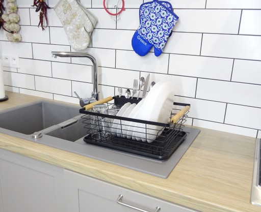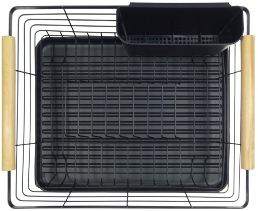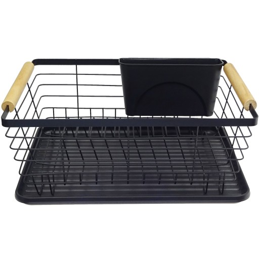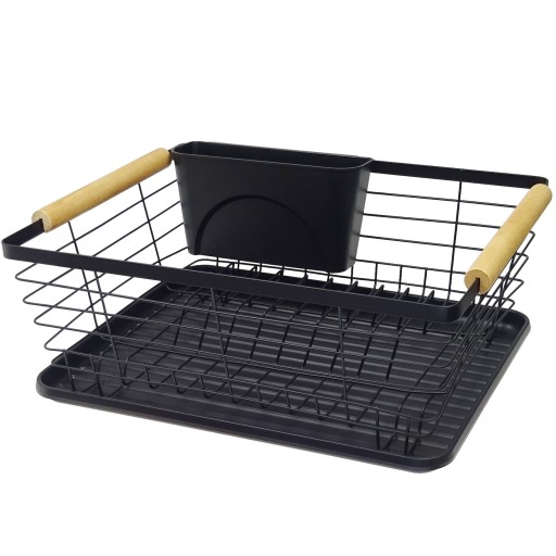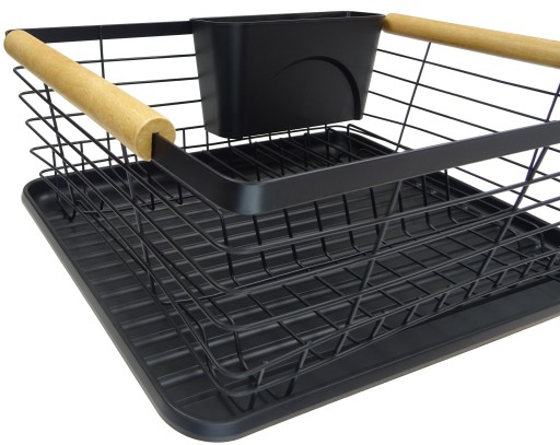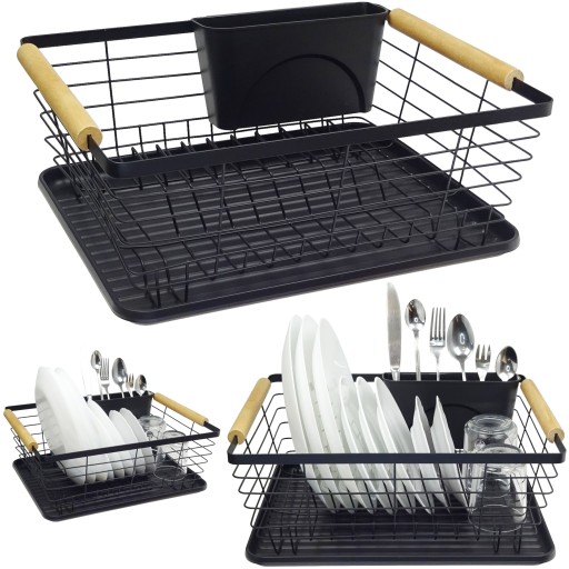 Suszarka do naczyń cechuje wysoka jakość a także trwała i metalowa konstrukcja. Tacka wykonana z żywicy zabezpiecza blat przed zamoczeniem. Zestaw zawiera również plastikowy, dwukomorowy ociekacz na sztućce. Metalowa czarna suszarka z drewnianymi uchwytami pasuje do każdej kuchni.