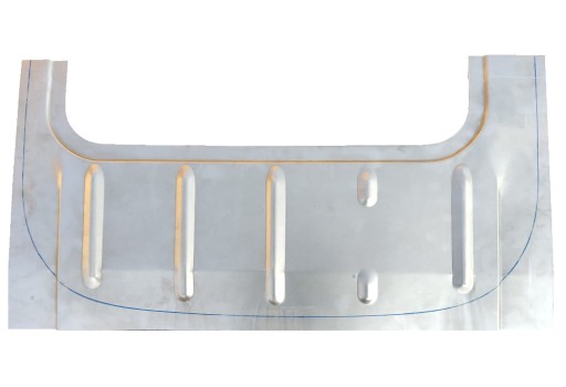 Podłoga wykonana z naddatkiem. Właściwy obrys narysowany niebieskim pisakiem do samodzielnego obcięcia lub wygięcia naddatku oraz samodzielnego nawiercenia otworów pod zbiornik paliwa.