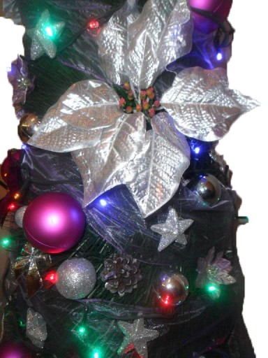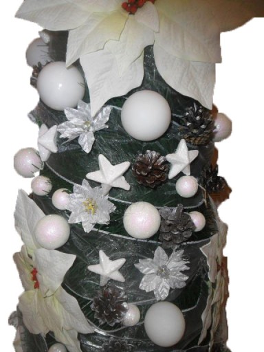 Wykonujemy choinki z dekoracją w kolorze: srebrnym, białym, złotym, niebieskim, czerwonym, brązowym, zielonym, fioletowym lub mieszanym np. złoto-czerwona.