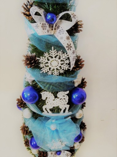 Wykonujemy choinki z dekoracją w kolorze: srebrnym, białym, złotym, niebieskim, czerwonym, brązowym, zielonym, fioletowym lub mieszanym np. złoto-czerwona.