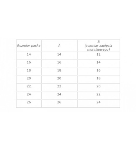 Uwaga: Rozmiar zapięcia motylkowego 22 mm pasuje do paska w rozmiarze A-24 mm, w przypadku pasków równoległych gdzie nie ma zwężenia paska przy klamerce, rozmiar 22 odpowiada paskowi o rozmiarze A-22 mm.