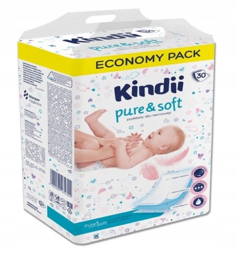 Na Tej Aukcji Dostępne Podkłady dla niemowląt KINDII Pure&Soft o wymiarach 40x60 pakowane po 30 sztuk.