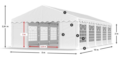 1 - Dach PE (polietylen) ok. 240 g/m² 2 - Brama typu kurtyna 3 - Mocne zamki YKK przy wjazdach 4 - Wymienne maskownice 5 - Ściany boczne PE 2 x 2 m (polietylen) ok. 240 g/m² - Okna witrażowe 140 x 130 cm 6 - Oczka mocujące plandekę