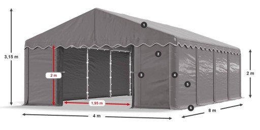 1 - Dach PE (polietylen) ok. 240 g/m² 2 - Brama typu kurtyna 3 - Mocne zamki YKK przy wjazdach 4 - Wymienne maskownice 5 - Ściany boczne PE 2 x 2 m (polietylen) ok. 240 g/m² 6 - Oczka mocujące plandekę