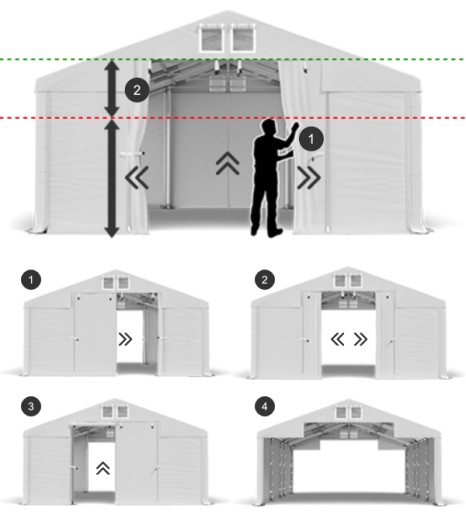 3. Otwarte główne wejścia/wjazdy oraz odpięte wszystkie ścianki z jednego boku namiotu.