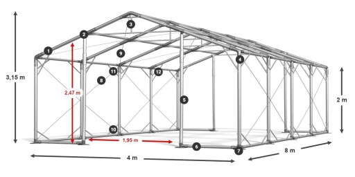 1 - Rury konstrukcyjne fi ok. 50 mm 2 - Łączniki konstrukcji fi ok. 54 mm 3 - Wzmocniona konstrukcja dachowa 4 - Mocne śruby przechodzące na wylot 5 - Wzmocnienia wjazdów 6 - Wzmocniona konstrukcja podłogowa 7 - Powiększone stopy fi 14 cm 8 - Naciągi boczne 9 - Naciągi dachowe 10 - Zastrzały boczne dolne 11 - Zastrzały boczne górne 12 - Zastrzały dachowe