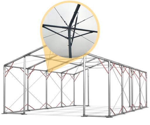 Konstrukcja posiada górne i dolne zastrzały umiejscowione przy dachu oraz ścianach bocznych. Jest to najskuteczniejszy sposób ochrony przed niekorzystnymi warunkami atmosferycznymi. Ta innowacyjna metoda zapewnia całkowitą stabilność namiotu.