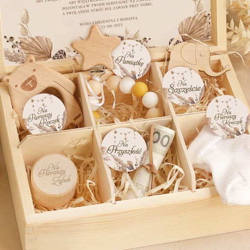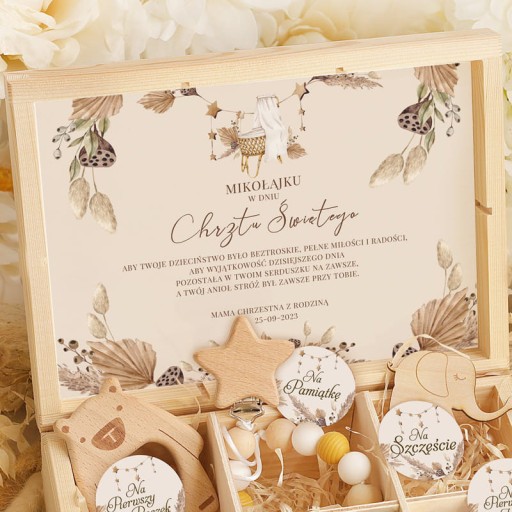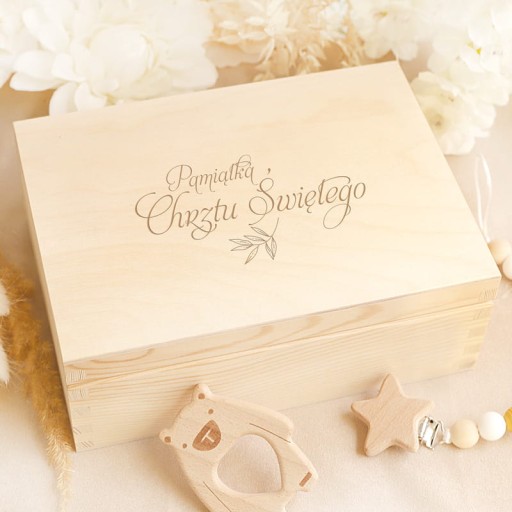 - Drewniana skrzyneczka - niezbędnik dla dziecka. Na wieczku znajduje się grawer Pamiątka Chrztu Świętego.