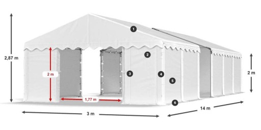 Namiot 3m x14m 2m jest złożony z namiotów o wymiarach: 3x6m, 3x6m, 3x2m.