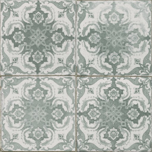 Płytki podłogowe i ścienne PerondaFS-3 45x45cechują się niezwykle romantycznym charakterem. Malowane na białym tle koronkowe, fantazyjne wzory uzupełnione są akcentami roślinnymi. Ornamentykę cechuje interesujący kolor zielonkawej szarości. Cała płytka składa się z czterech osobnych elementów oddzielonych od siebie imitacją fugi, które w połączeniu dają spójną kompozycyjnie całość. Efekt postarzenia jest świadomym zabiegiem estetycznym.