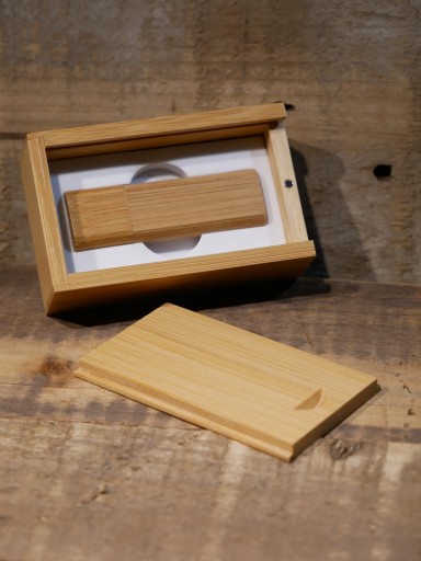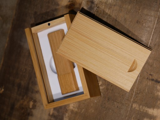 Pamięć USB jak i pudełko wykonane są z drewna w kolorze carbonized.