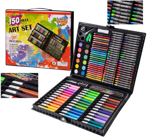 Zaskocz swoje dziecko tym wspaniałym zestawem, który z pewnością jest marzeniem każdego chłopca i dziewczynki lubiących rysować czy malować! Twoje dziecko będzie mogło tworzyć piękne obrazy i rysunki. Ogromny zestaw akcesoriów dla małego artysty zawiera aż 150 elementów. Całość ukryta jest w estetycznie wykonanej walizce, dzięki której każdy element ma swoje miejsce i zestaw możemy zabrać wszędzie.