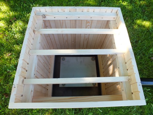 - Komora wędzarnicza wykonana z deski ze świerka , składana na pióro-wpust zapewniające szczelność, grubość deski 20mm(+/-) 1 mm. Wymiary skrzyni wędzarniczej 50x50x111 (wysokość podana z podstawą oraz kominem)