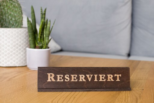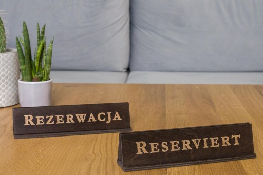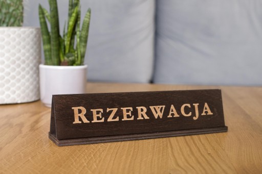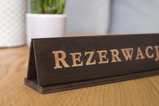 Drewniana tabliczka przymocowana do solidnej podstawki z wyraźnym grawerowanym napisem Rezerwacja.