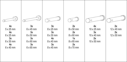 Zestaw 60 sztuk sworzni z łbem i otworem. Zestaw zawiera rozmiary od 5x25 mm aż do 12x50 mm. Całość umieszczono w wygodnym opakowaniu typu sortownik.