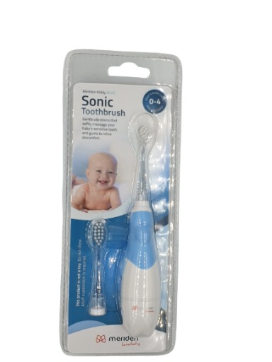 Szczoteczka soniczna MERIDEN Kiddy, końcówka MERIDEN Kiddy 0-18 miesięcy, końcówka MERIDEN Kiddy 18-48 miesięcy, 1 bateria AAA, instrukcja obsługi, karta gwarancyjna.