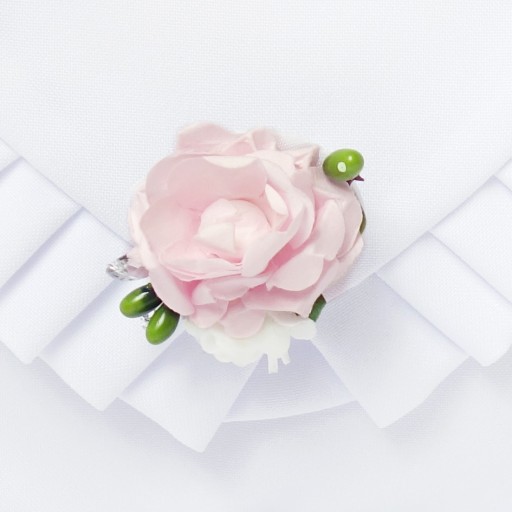 Przypinkę tworzą różowa i biała różyczka z dodatkiem zielonego oraz przeźroczystymi koralikami. Ozdoba wykonana z materiałów papierniczych i sztucznych. Nie należy narażać jej na zamoczenie. Przypinkę odpiąć przed praniem torebki.