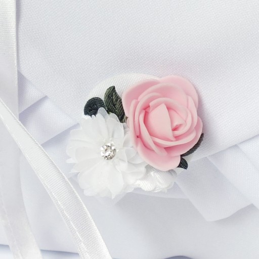 Torebka komunijna. Oferujemy torebkę komunijną z przypinką kwiatową. Torebka jest biała, typu kopertówka, zamknięcie na rzep. Klapka torebki zamykana jest na rzep. Ozdobiona plisami oraz przypinką kwiatową.