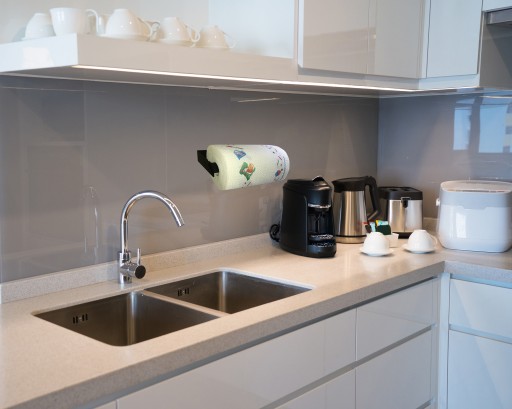 Uchwyt na ręcznik papierowy zamieszczony na ścianie pozwala zaoszczędzić miejsce na blacie czy szafce.