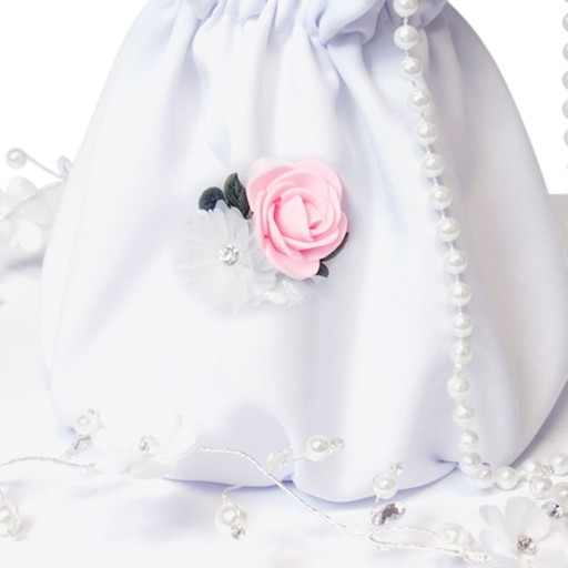 Torebka komunijna. Oferujemy torebkę komunijną typu: woreczek z ozdobą kwiatową. Torebka przeznaczona jest do noszenia na ramieniu. Pasek torebki to subtelny sznureczek koralików imitujących perełki.