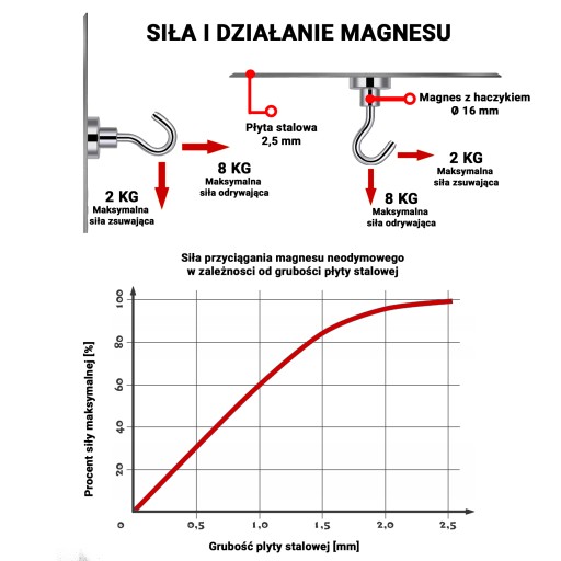 Podana siła udźwigu została zmierzona przy odrywaniu prostopadłym od kilkumilimetrowej płyty stalowej. Uwaga! Inną siłę będzie miał haczyk przymocowany do sufitu, a inną do ściany. Kluczowa jest też grubość materiału, do którego został przymocowany uchwyt, dlatego sugerujemy przetestować magnes w danych warunkach.