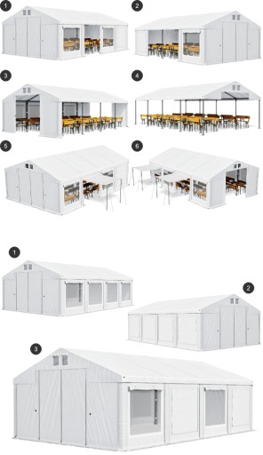 Namioty składane są z modułów o długości 2, 4, 6, 8, 10 lub 12 m oraz 1, 2-metrowych przedłużeń.