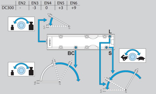 - Regulowana szybkość zamykania drzwi, szybkość zatrzaskiwania oraz regulacja funkcji back-check poprzez regulację frontowych zaworów