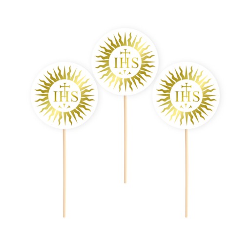 Papierowe, dwustronne toppery Komunia Święta IHS złote.