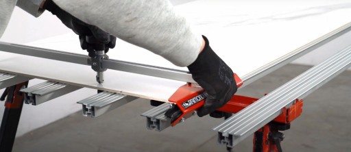 - Wykonując nacięcia, trzymaj T-CUT na krawędzi i przesuwaj go po krawędzi boku na całej długości płyty, jednocześnie naciskając na wózek z kółeczkiem tnącym