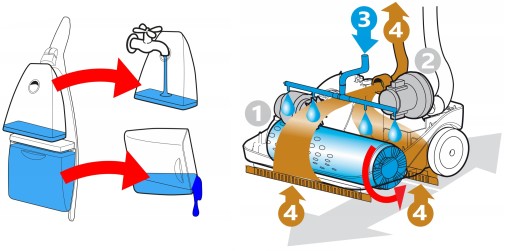 - Może odsysać wodę podczas poruszania się zarówno do przodu, jak i do tyłu.