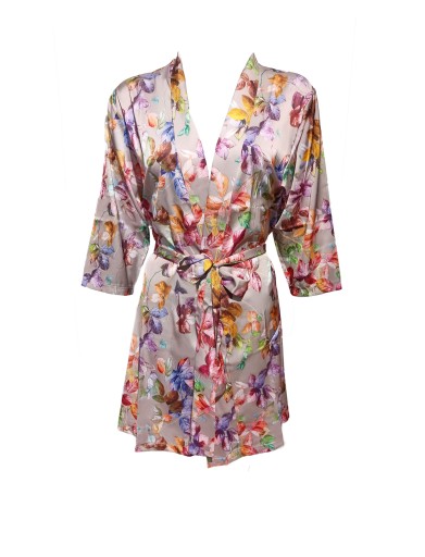 Satynowy szlafrok damski długości mini, w modnym wzorze botanic.