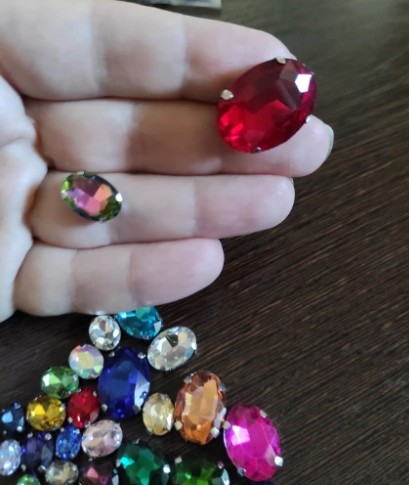 Precyzyjnie oszlifowane kamienie efektownie się błyszczą. W każdym kamieniu są cztery otwory, które umożliwiają łatwe naszycie. Od spodu są pokryte farbą kryjącą, która chroni przed zabarwieniem materiału podkładowego. Kamieni można użyć do wyrobu szytej biżuterii czy ozdabiania odzieży. Doskonale wyróżnią się na sukienkach, bluzkach i dodatkach jak torebki, kapelusze itp.