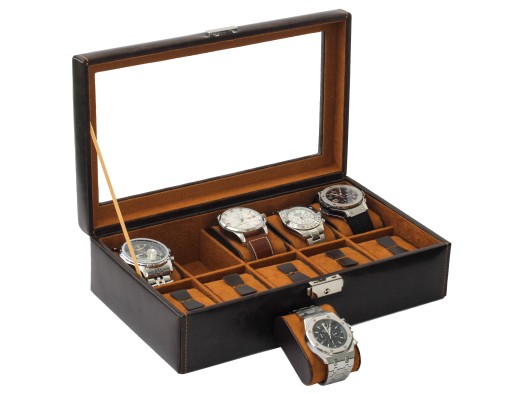 Świetna pudełko / witryna skórzane na 10 zegarków z dużym przeszkleniem - skóra ekologiczna. Ciemny brąz. Dotatkowy otwór na kabel do ładowania smartwatcha. Perfekcyjna jakość wykonania.