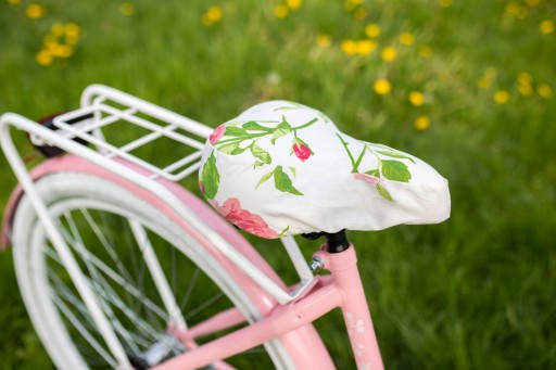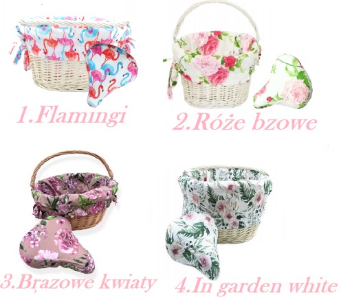 Kosz: wiklinowy biały mocowany na haki z wyściółką i pokrowcem na siodło do wyboru (wzór podaj w wiadomości dla sprzedającego, brak informacji oznacza losowo wysłany wzór)