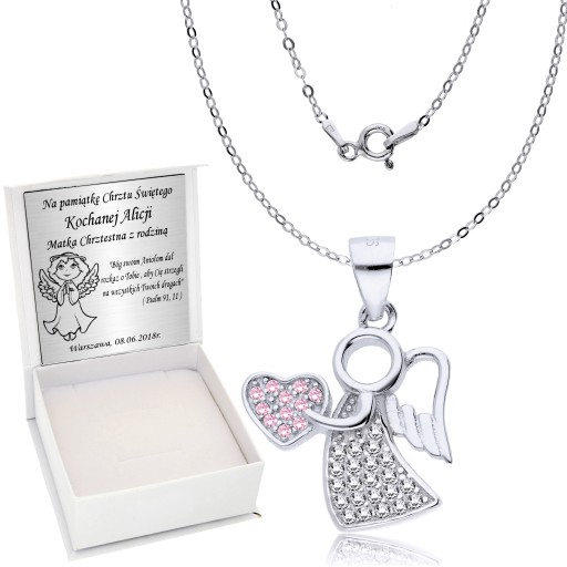 Aniołek wysadzany cyrkoniami, a serce cyrkoniami w kolorze różowym