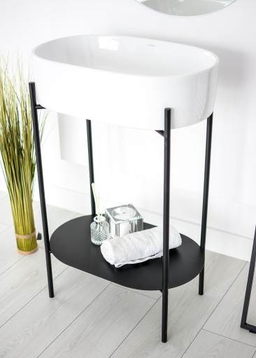 Nowoczesny stelaż/konsola łazienkowa pod umywalkę model OLTENS LOM UMYWALKA 55X34 CM NABLATOWA OWALNA z nakładaną półką.
