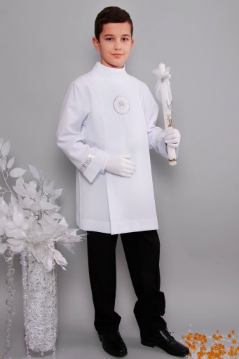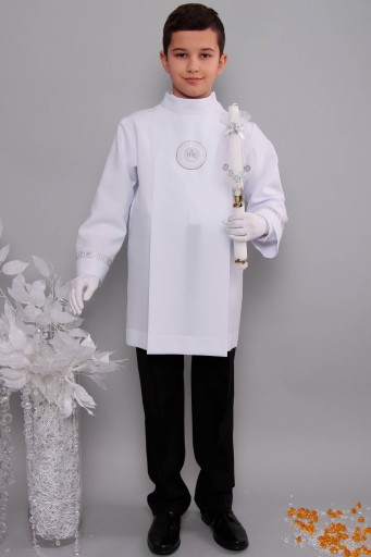 Krótka alba chłopięca ozdobiona jest na rękawach elegancką srebrną taśmą z motywem rzymskim.